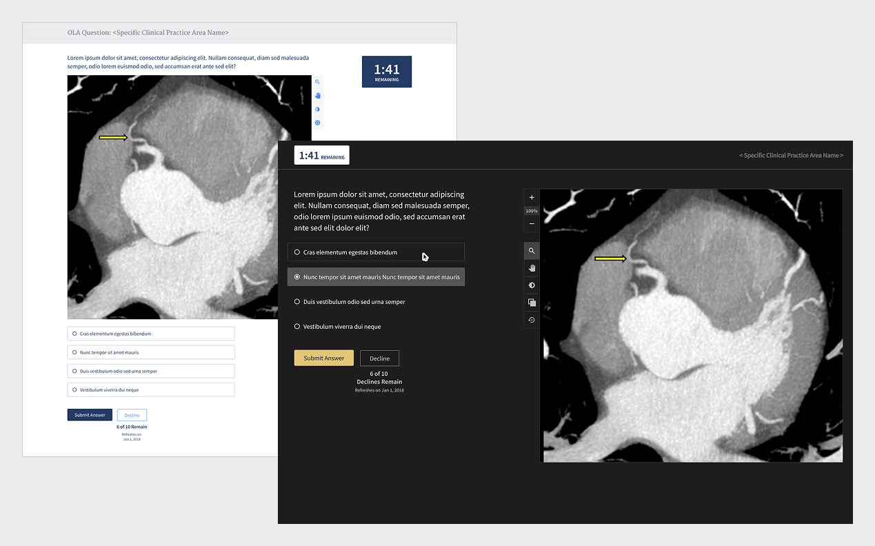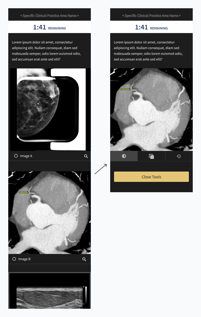 Our quiz needed users to jump in and study imagery as they would in a real world scenario so we had to include the tools they would need to do so. To ensure time was spent focused on answering the question, I placed additional functionality in a prominent place near the asset and used icons that were in other ABR tools so that they were immediately recognizable.