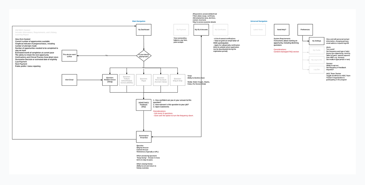 A quiz seems like a simple, straightforward flow. A question is asked, an answer is selected, a result is displayed. To the user, yes, this is how it should seem. However, there is so much more going on behind the scenes that my team had to think about. How are answers being tracked? What happens if they get a question wrong? What type of media is involved in the question, if any? What subject matter bank is it pulling from? What happens if they log in from an unsupported device? We worked with ABR to design a user flow to determine all paths that needed to be created before we dove into wireframes.