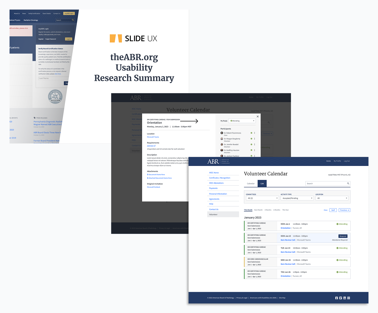 Users were over the moon about having the burden of a time intensive formal test replaced with a quiz that used applied knowledge and was easy to execute. ABR came back to my team to ask us to create the Remote Oral Exam, the Certification exam, key pages of their intranet and volunteer hub, and to conduct usability studies.